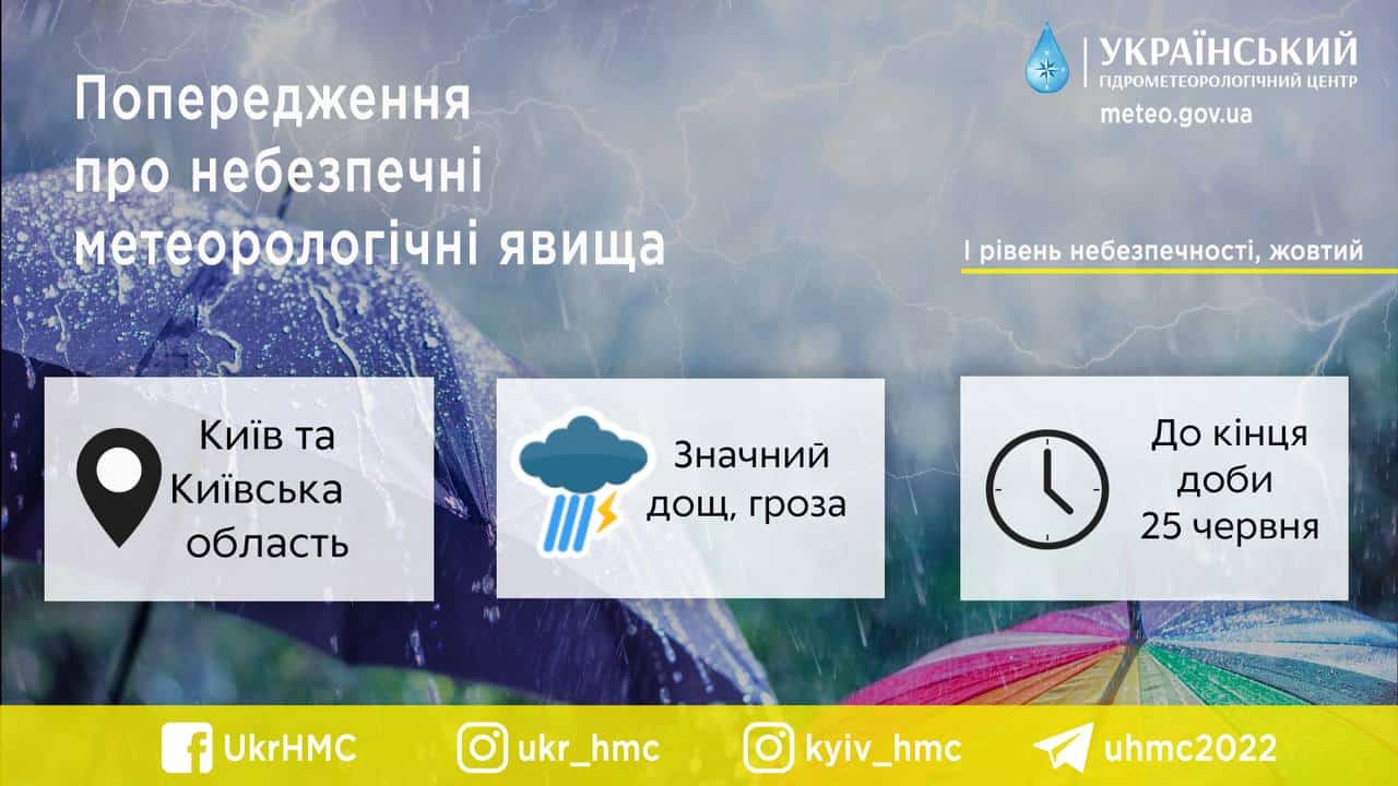 За даними синоптиків, вдень 25 червня значний дощ, гроза. У зв’язку з цим оголошено І рівень небезпеки – жовтий.