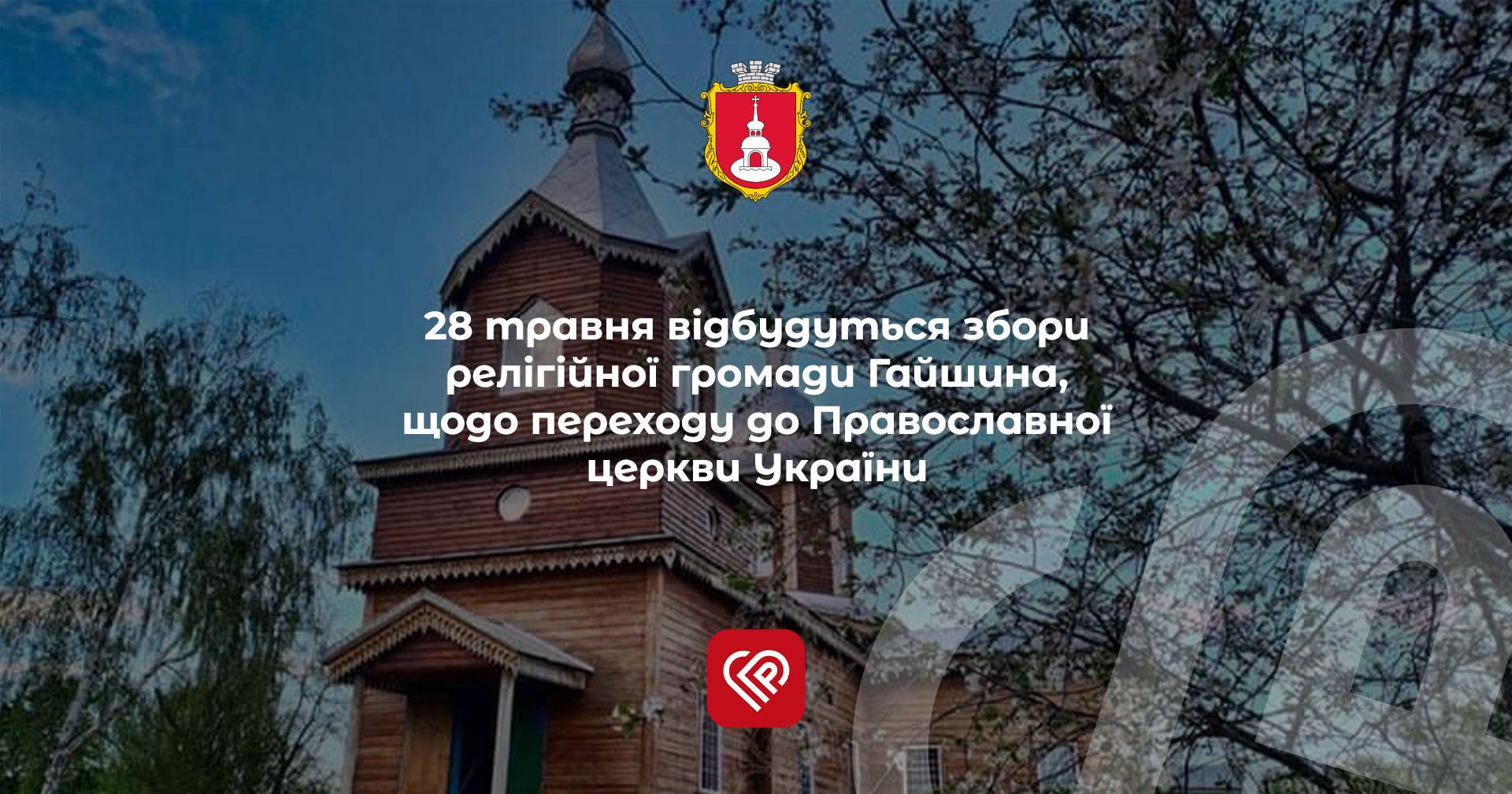 В цю суботу, 28 травня о 15:00 поруч з церквою Івана Богослова в с. Гайшин відбудуться збори релігійної громади сіл Гайшин, Чирське, Гребля, щодо переходу церкви з Української православної церкви московського патріархату до Православної церкви України, у зв’язку зі збройною агресією російської федерації та активної підтримки цих дій церквами московського патріархату.
