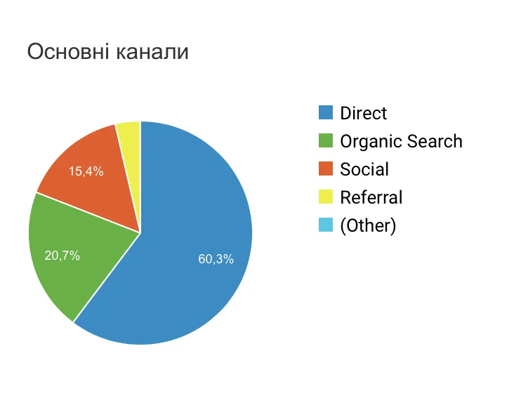 - Прямий трафік (direct) – 60,3% (777 092 користувача);