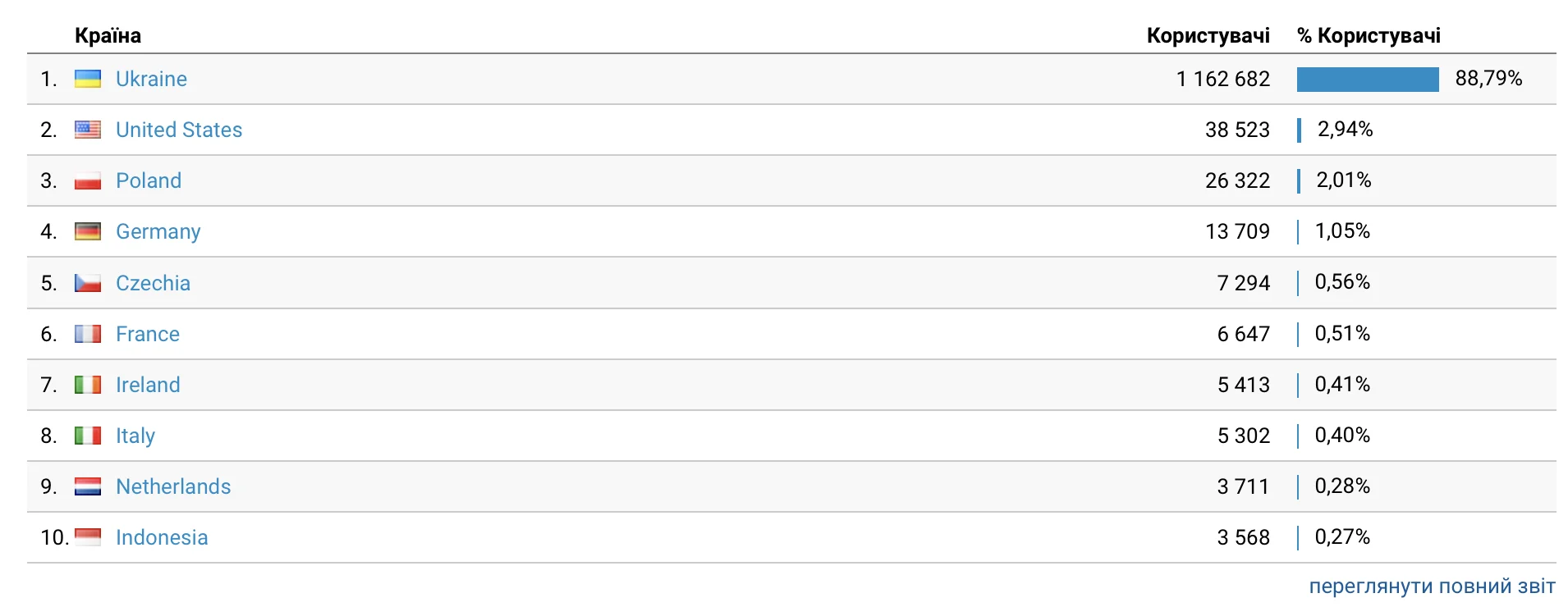 - Україна – 88,79% (1 162 682 користувача);