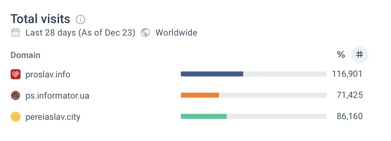 Спираючись на відкриті данні сервісу Similarweb, за останні 28 днів, proslav.info є лідером у кількості відвідувань сайту.