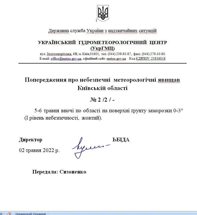 Український гідрометеорологічний центр попереджає: 5-6 травня вночі по Київській області на поверхні ґрунту можливі заморозки 0-3 градуси Цельсія (1 рівень небезпечності, жовтий).