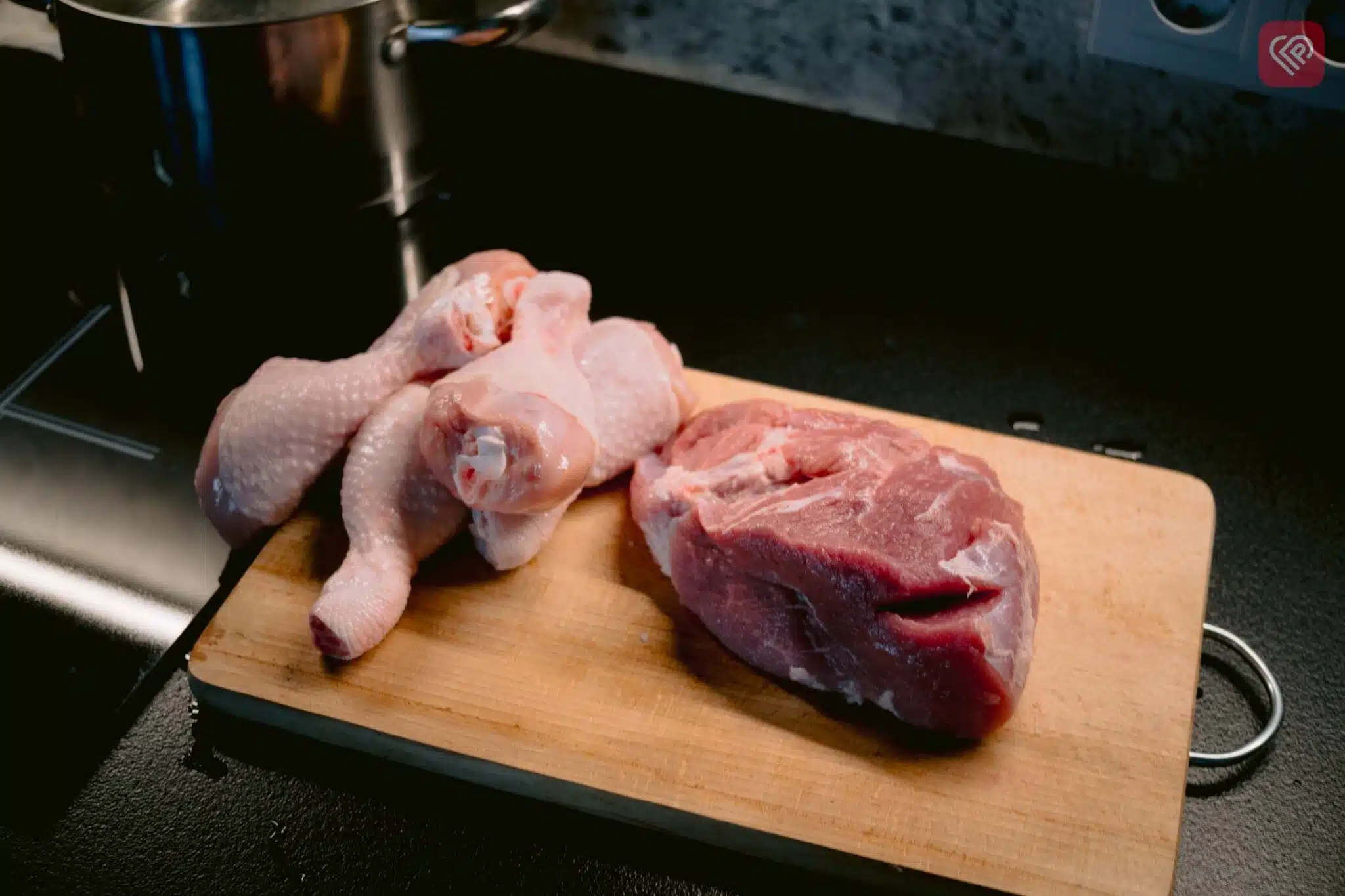 Свинину та курячі гомілки треба зачистити від плівок та жиру. Покласти все у велику каструлю та залити 2,5-3 літрами води.