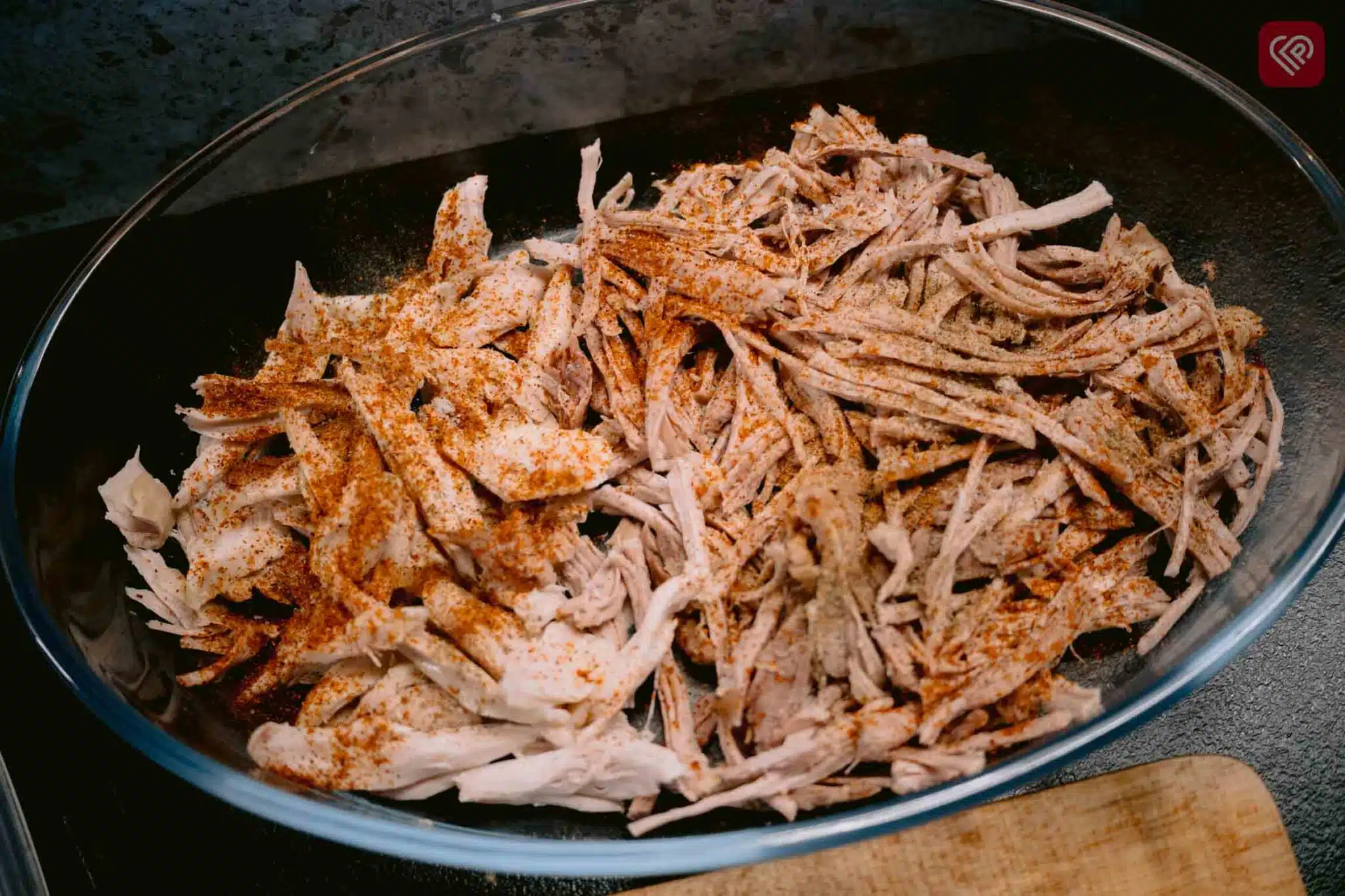Я використовував все мʼясо в холодці, на одну сторону – курку, на іншу – свиню. Також поверх я додав копчену паприку, аби був кльовий колір. Мʼясо заливаємо бульйоном та залишаємо охолоджуватися за кімнатної температури. Потім переставляємо в холодильник (або на балкон) для стабілізації на ніч.