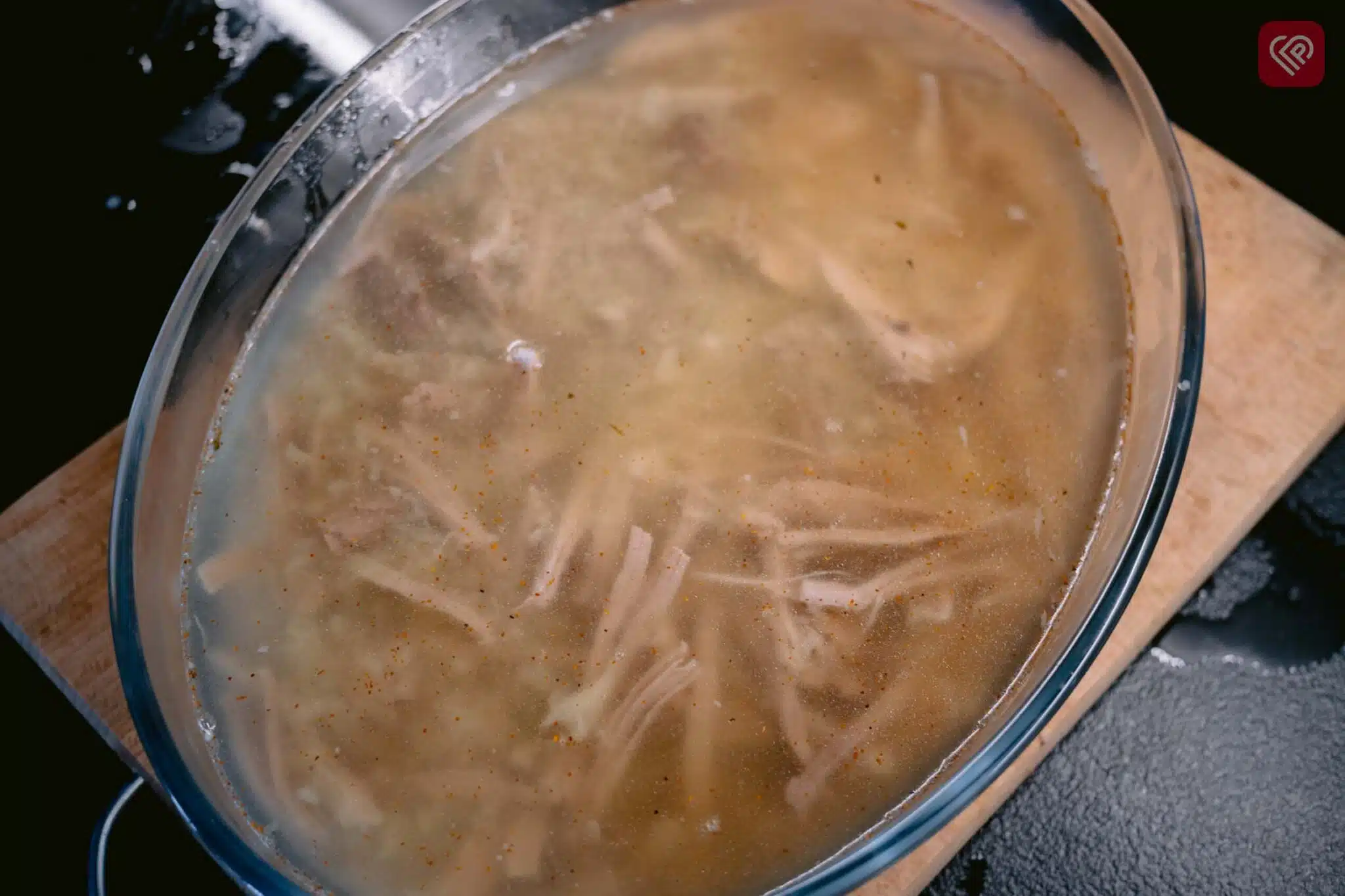 Чекаємо аби вода закипіла, знімаємо шум, додаємо лавровий лист та духмяний перець. Ставимо на маленький вогонь. Через годину дістаємо звідти курячі гомілки, а ще через пів години – свинину. Розділяємо мʼясо на волокна.