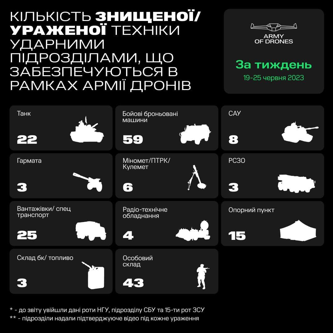 «Із задоволенням спостерігаємо, як щотижня безпілотники Армії дронів в умілих руках наших героїв ефективно нищать ворога», – пише міністр.