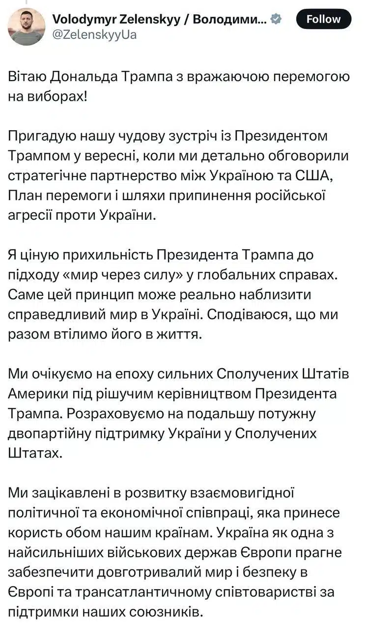 Тим часом, Президент Зеленський уже привітав Дональда Трампа з “вражаючою перемогою на виборах”.