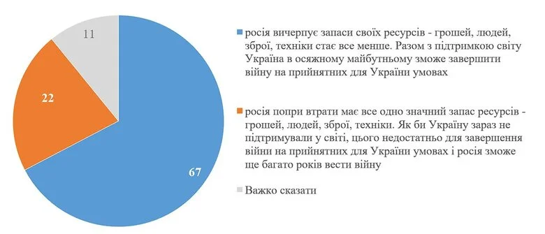 «Більшість українців – 67% – вважають, що Росія вичерпує свої ресурси й що для України реально разом із партнерами не у віддаленому майбутньому здобути перемогу. Вірять у значний запас ресурсів росіян і тривале виснажливе протистояння з туманним кінцем – 22%. Ще 11% не змогли визначитися з цього питання», – йдеться у звіті організації.