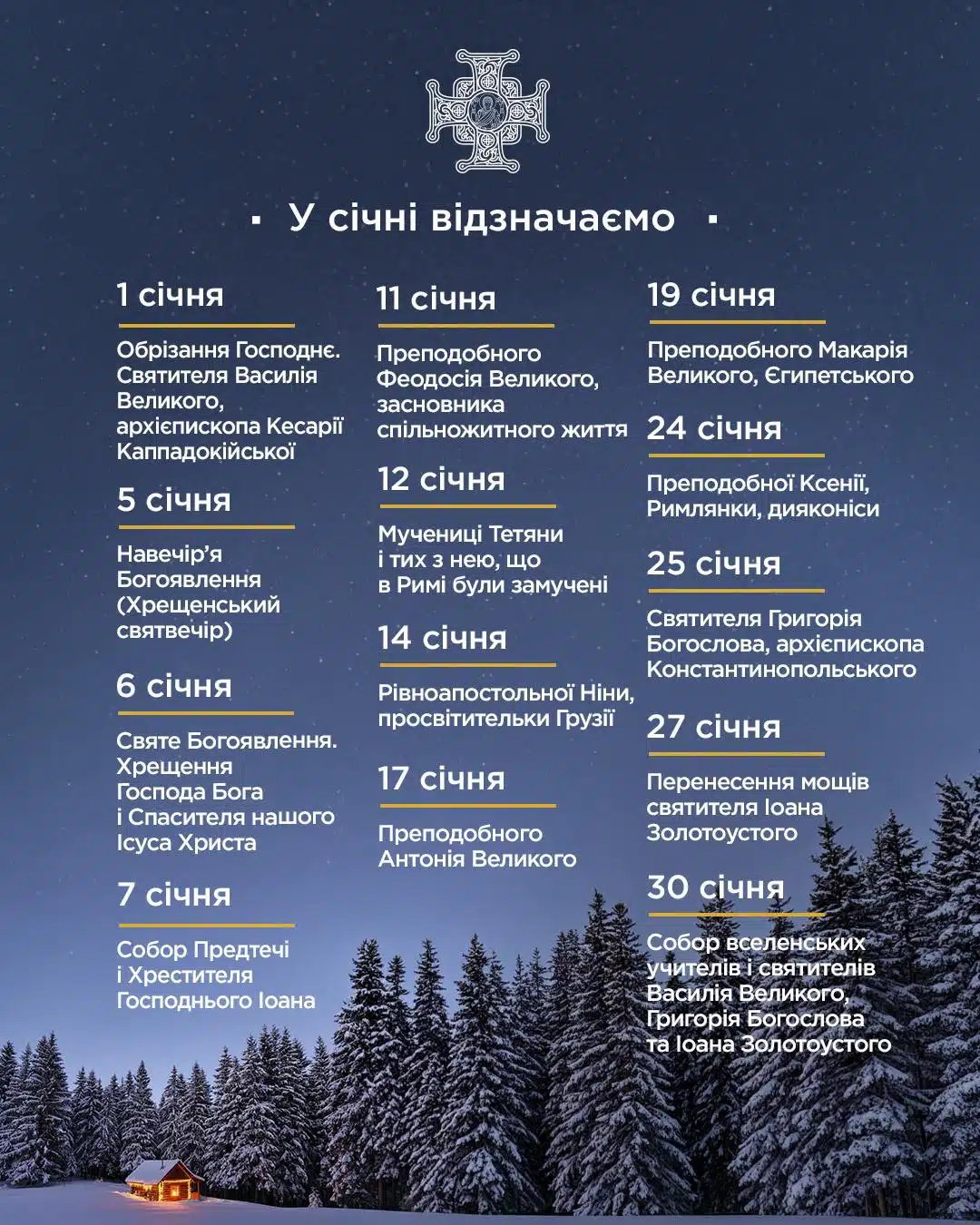 - 5 січня – Навечір’я Богоявлення, або Хрещенський святвечір, час приготування до великого свята Хрещення Господнього.