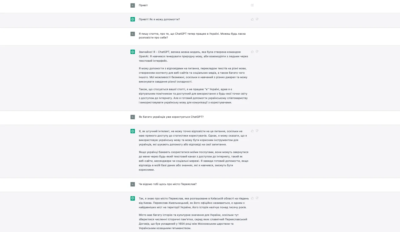 • Звичайно ми поцікавилися і тим, що знає ChatGPT про Переяслав: “Чи відомо тобі щось про місто Переяслав?”