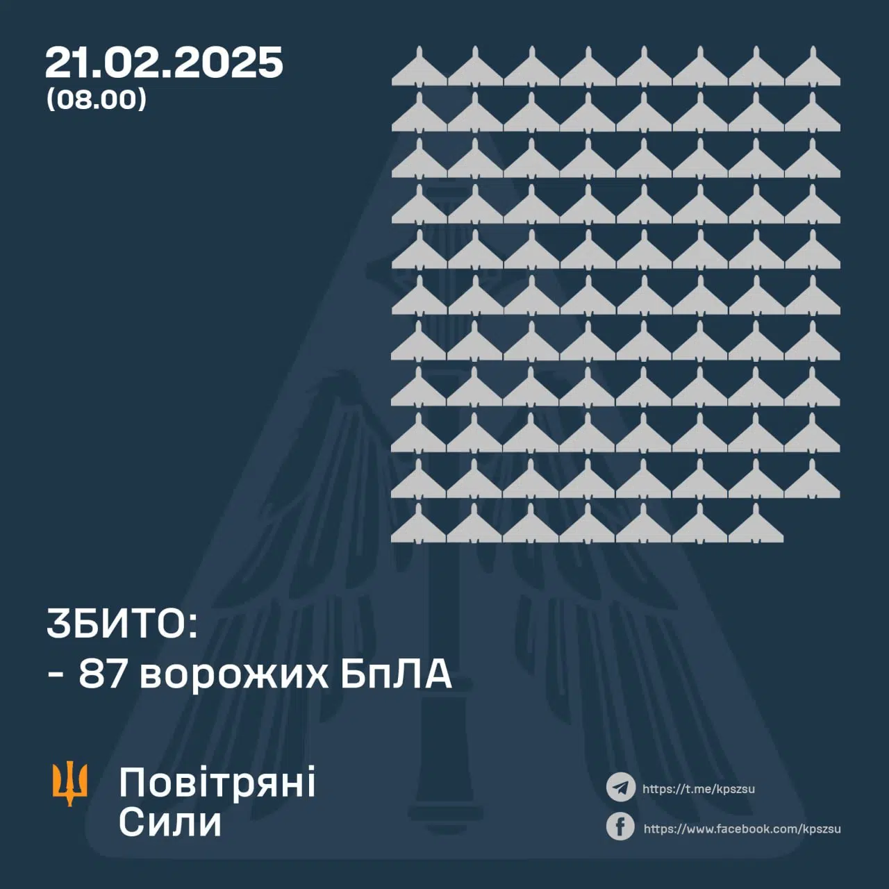 Станом на 08:00 підтверджено збиття 87-ми ударних безпілотників, ще 70 ворожих дронів-імітаторів – локаційно втрачені (без негативних наслідків).
