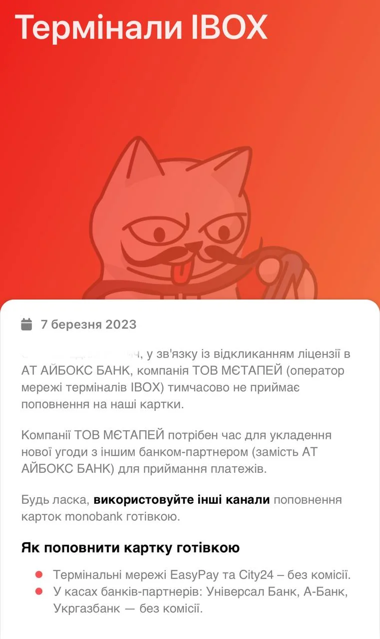 Чому термінали IBOX Bank тимчасово не працюватимуть і як надалі клієнтам Monobank поповнювати картки