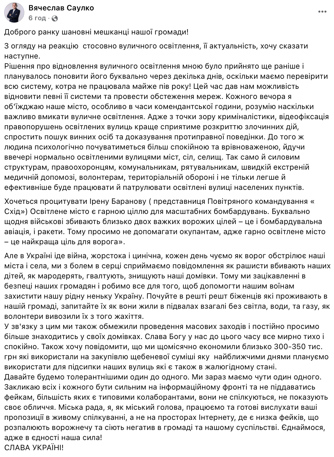 Сьогодні голова Переяславської громади Вячеслав Саулко на своїй сторінці у Facebook звернувся до жителів громади та пояснив ситуацію, щодо вуличного освітлення: “Рішення про відновлення вуличного освітлення мною було прийнято ще раніше і планувалось поновити його буквально через декілька днів, оскільки маємо перевірити всю систему, котра не працювала майже пів року! Цей час дав нам можливість відновити певні її системи та провести обстеження мереж. Кожного вечора я об’їжджаю наше місто, особливо в часи комендантської години, розумію наскільки важливо вмикати вуличне освітлення. Адже з точки зору криміналістики, відеофіксація правопорушень освітлених вулиць краще сприятиме розкриттю злочинних дій, спростить пошук винних осіб та доказування протиправної поведінки. До того ж людина психологічно почуватиметься більш спокійною та врівноваженою, йдучи ввечері нормально освітленими вулицями міст, сіл, селищ. Так само й силовим структурам, правоохоронцям, комунальникам, рятувальникам, швидкій екстреній медичній допомозі, волонтерам, територіальній обороні і не тільки легше й ефективніше буде працювати й патрулювати освітлені вулиці населених пунктів.”