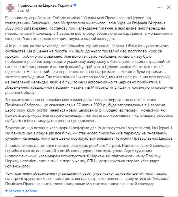 «Зауважимо, що питання календарної реформи давно дискутується і в суспільстві, і в Церкві. І ми бачимо, що з року в рік все більшим стає число прихильників переходу на оновлений, сучасний календар, яким вже давно користуються більшість Помісних Православних Церков. З новою силою це питання постало внаслідок російської агресії. Нині юліанський календар сприймається як пов’язаний з російською церковною культурою. Адже сучасним (новоюліанським) календарем користуються ті Церкви, які підтримують нашу Помісну Церкву, натомість опоненти і, в першу чергу, РПЦ – дотримуються старого календаря (юліанського). Тож прагнення збереження і утвердження своєї, української, духовної ідентичності, захист від агресії «русского міра», вимагають від нас назрілого рішення – долучитися до більшості Помісних Православних Церков і запровадити у вжиток новоюліанський календар», – йдеться у повідомленні.