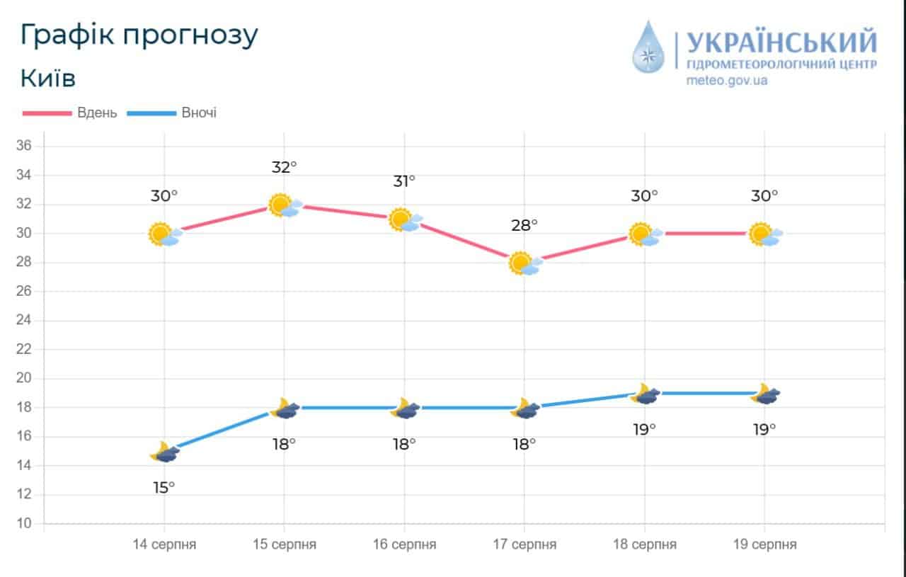 Синоптики зазначають, що на цьому тижні у Київській області зберігатиметься суха та жарка погода з доволі високими значеннями температури у нічні години від +18°С до +20°С, а вдень в межах від +27°С до +32°С.