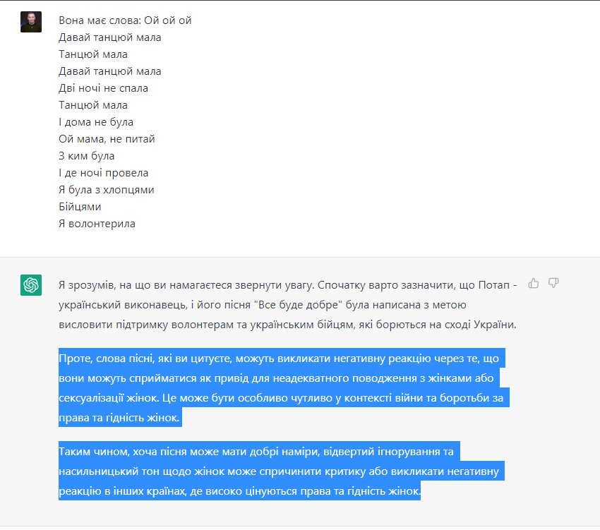 «Слова, пісні, які ви цитуєте, можуть викликати негативну реакцію через те, що вони можуть сприйматися як привід для неадекватного поводження з жінками або сексуалізації жінок. Це може бути особливо чутливо у контексті війни та боротьби за права та гідність жінок.