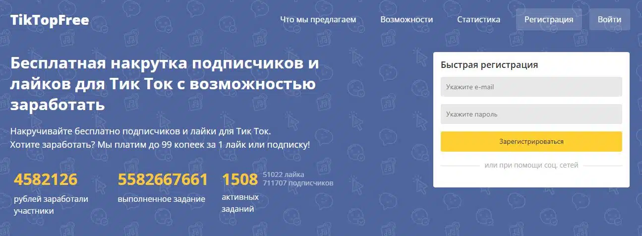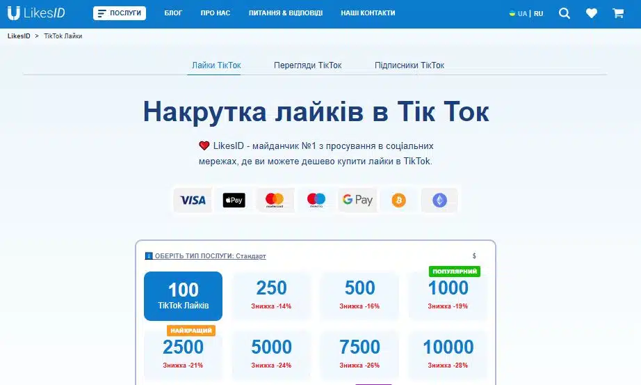 Відомий сервіс, що надає послуги з просування на 10+ майданчиках. Працює протягом 4-х років, має чимало позитивних відгуків. Накрутка лайків в Тік Ток виконується на таких умовах:
