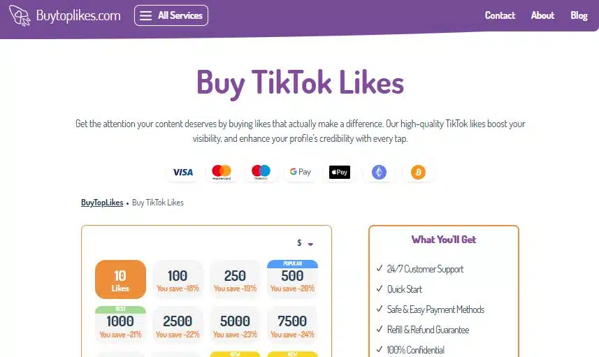 Сервіс пропонує купити лайки в Тік Ток за ціною від $1.49 за пакет — це одні з найнижчих розцінок на ринку. А на замовлення великого обсягу діють знижки до 35%.