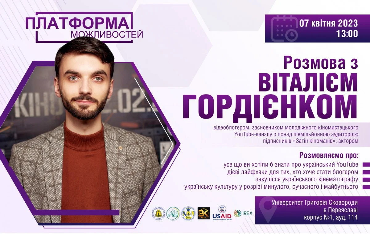 У наступну п’ятницю, 7 квітня 2023 року о 13:00 в 114 аудиторії (Центр інноваційного навчання та трансферу технологій «Innovation Training & Tech Transfer Center») в Університеті Григорія Сковороди в Переяславі відбудеться відкрита зустріч з Віталієм Гордієнком – відеоблогером, засновником молодіжного кіномистецького YouTube-каналу з понад півмільйонною аудиторією підписників «Загін Кіноманів», актором.
