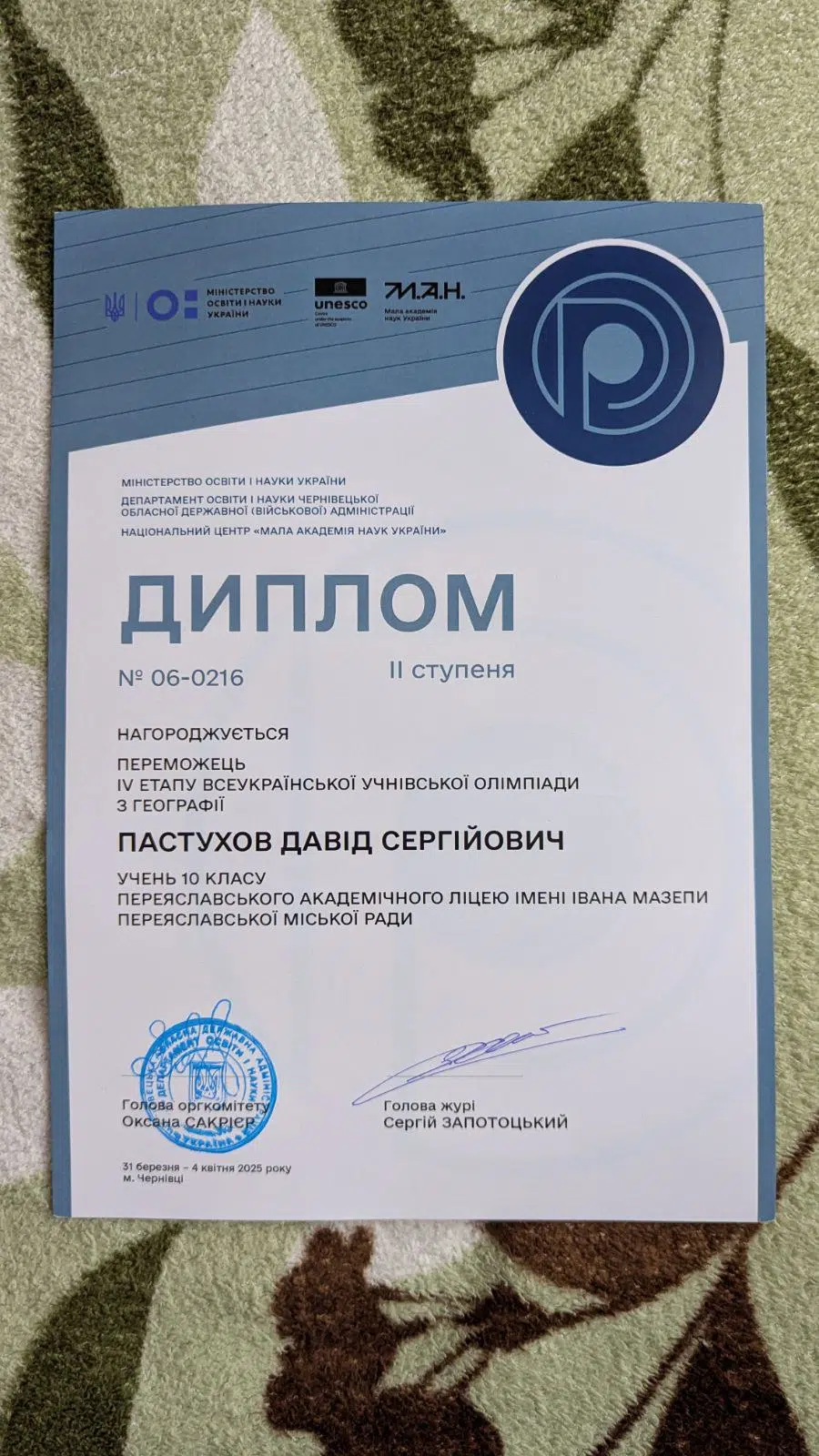 Десятикласник Переяславського академічного ліцею імені Івана Мазепи Давід Пастухов переміг на обласному етапі олімпіади з географії, а далі у складі команди області захищав честь Київщини на всеукраїнському рівні. Юнак продемонстрував високий рівень підготовки й здобув почесне ІІ місце!