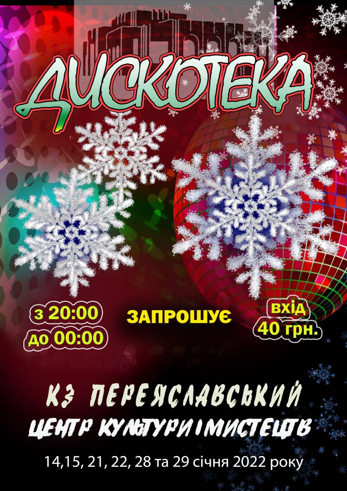 14, 15, 21, 22, 28 та 29 січня 2022 року з 20:00 до 00:00 будуть проводитись Дискотеки.