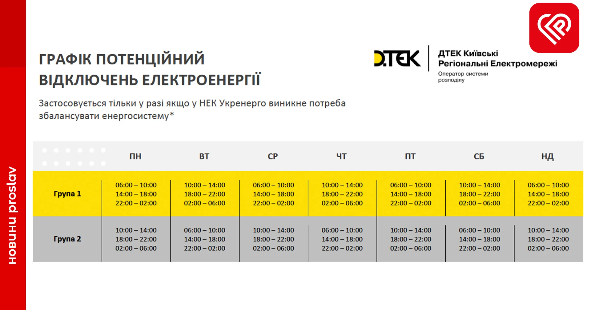 В Україні вводяться обмеження постачання електроенергії, про це proslav писав вчора. Сьогодні оператор системи розподілу електроенергії “ДТЕК Київські Регіональні Електромережі” опублікував графік потенційних відключень електроенергії, який застосовується тільки у разі, якщо у НЕК Укренерго виникне потреба збалансувати енергосистему.