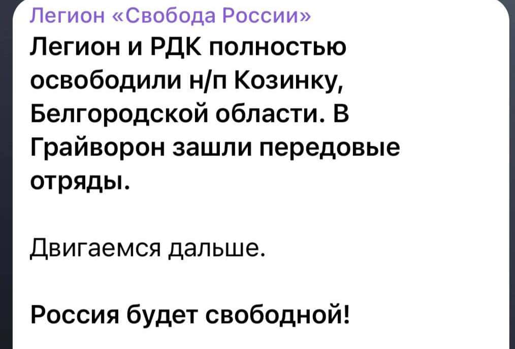 Згодом з’явились інші фото та відео-підтвердження. Окрім цього, представники російських добровольчих загонів повідомили, що повністю звільнили село Козінка в Бєлгородській області. Також вони повідомляють, що зайшли до міста Грайворон.