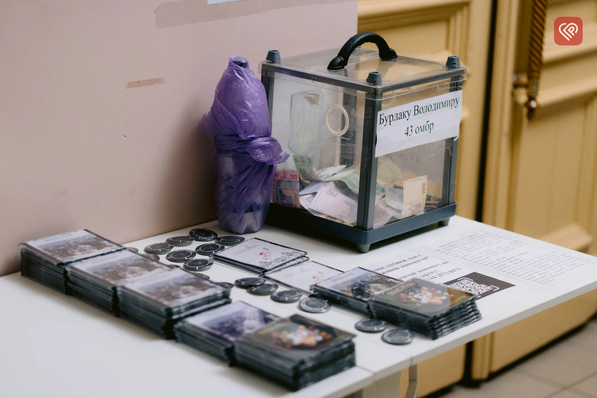 На вході до залу можна було придбати диски зі студійними альбомами, значками та іншим мерчем гурту. Кошти з них теж спрямують на волонтерські потреби для ЗСУ. Якщо у когось бракувало коштів, але дуже хотілося щось придбати пропонували кинути стільки, скільки може людина. Поза тим, була змога придбати збірник-альманах з віршами автора слів пісні «з фронтових доріг» під назвою «ДШВ» з нового репертуару гурту та інших талановитих людей. Кошти від її продажів передадуть на підтримку 80 бригади ДШВ.