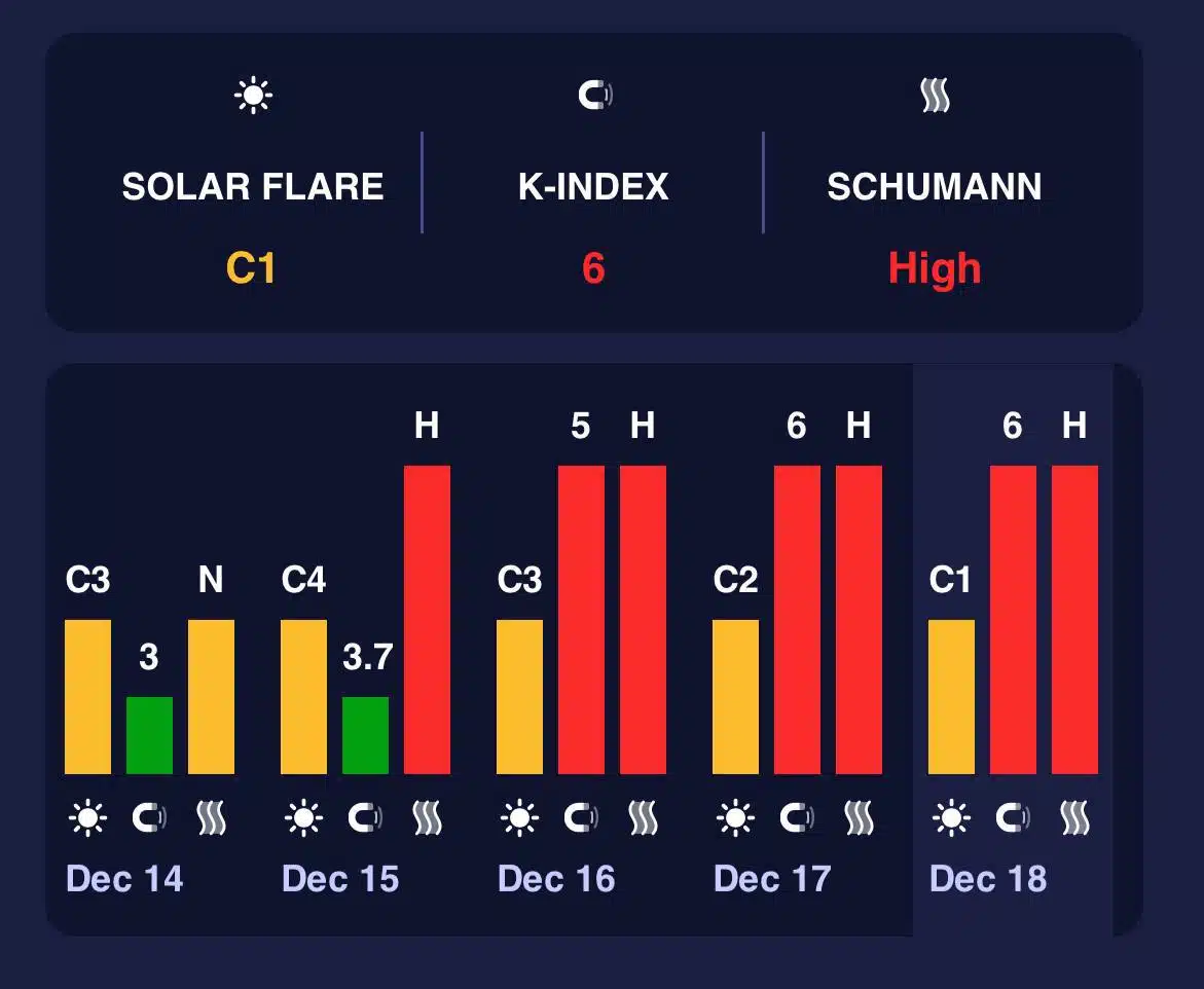Українці можуть відчувати погіршення самопочуття через сильну магнітну бурю. Йдеться про геомагнітне збурення рівня 6 балів, яке впливає на Землю вже два дні поспіль – 17 та 18 грудня. Про це повідомляє спеціалізований ресурс Meteoagent у прогнозі сонячної активності на грудень 2025 року.