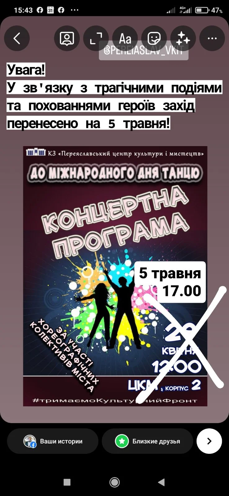 Так, концертну програму за участі хореографічних колективів міста «Танцювальний бум» до Міжнародного дня танцю перенесли. Захід відбудеться 5 травня о 17:00 у другому корпусі Центру культури та мистецтв, вхід вільний.