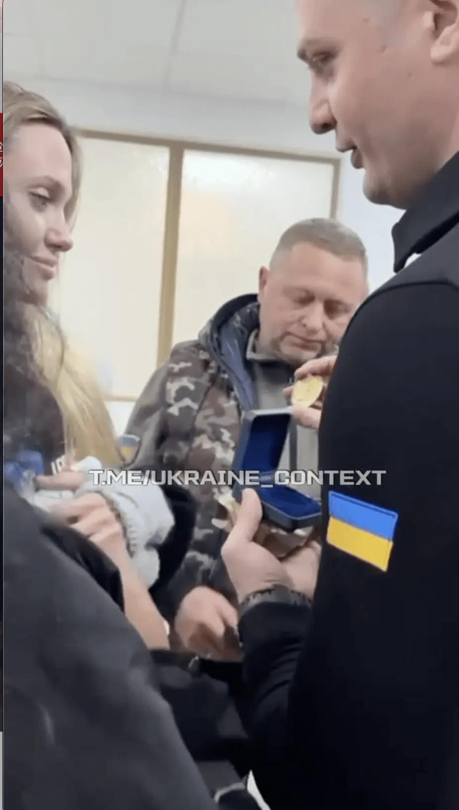 У Херсоні Анджеліна Джолі зустрілася з начальником міської військової адміністрації Ярославом Шаньком. Він подякував акторці за її підтримку та вручив пам’ятний сувенір – жетон з гербом і символами Херсона, яку створили у вересні 2025 року.