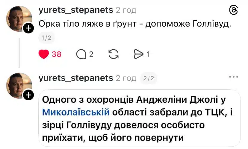 У будь-якій незрозумілій ситуації українці миттєво вмикають почуття гумору. Соцмережі вже заполонили меми про пригоди Анджеліни Джолі в Україні. Зокрема, користувачі жартують, що чоловік, якого затримали, міг бути колишнім акторки Бредом Піттом.