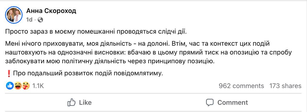 Скриншот ФБ-допису Анни Скороход з підтвердженням обшуків у її помешканні