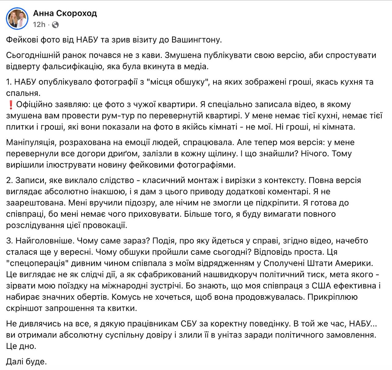 Скриншот ФБ-допису Анни Скороход, у якому вона запевняє, що на фото НАБУ не її квартира