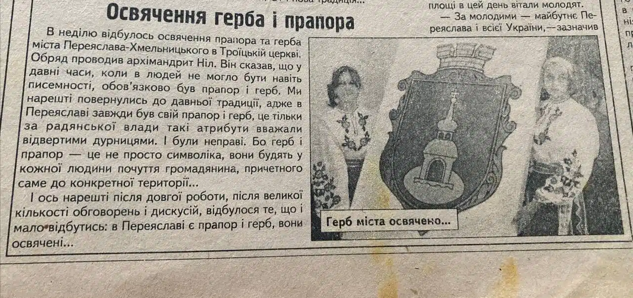 У День міста 1999 року відбулася урочиста церемонія освячення прапора й герба у Троїцькій церкві, яку провів архімандрит Ніл. Він наголосив, що містяни нарешті повернулись до давньої традиції, адже в Переяславі завжди був свій прапор і герб, це тільки за радянської влади такі атрибути вважали відвертими дурницями. І були неправі.