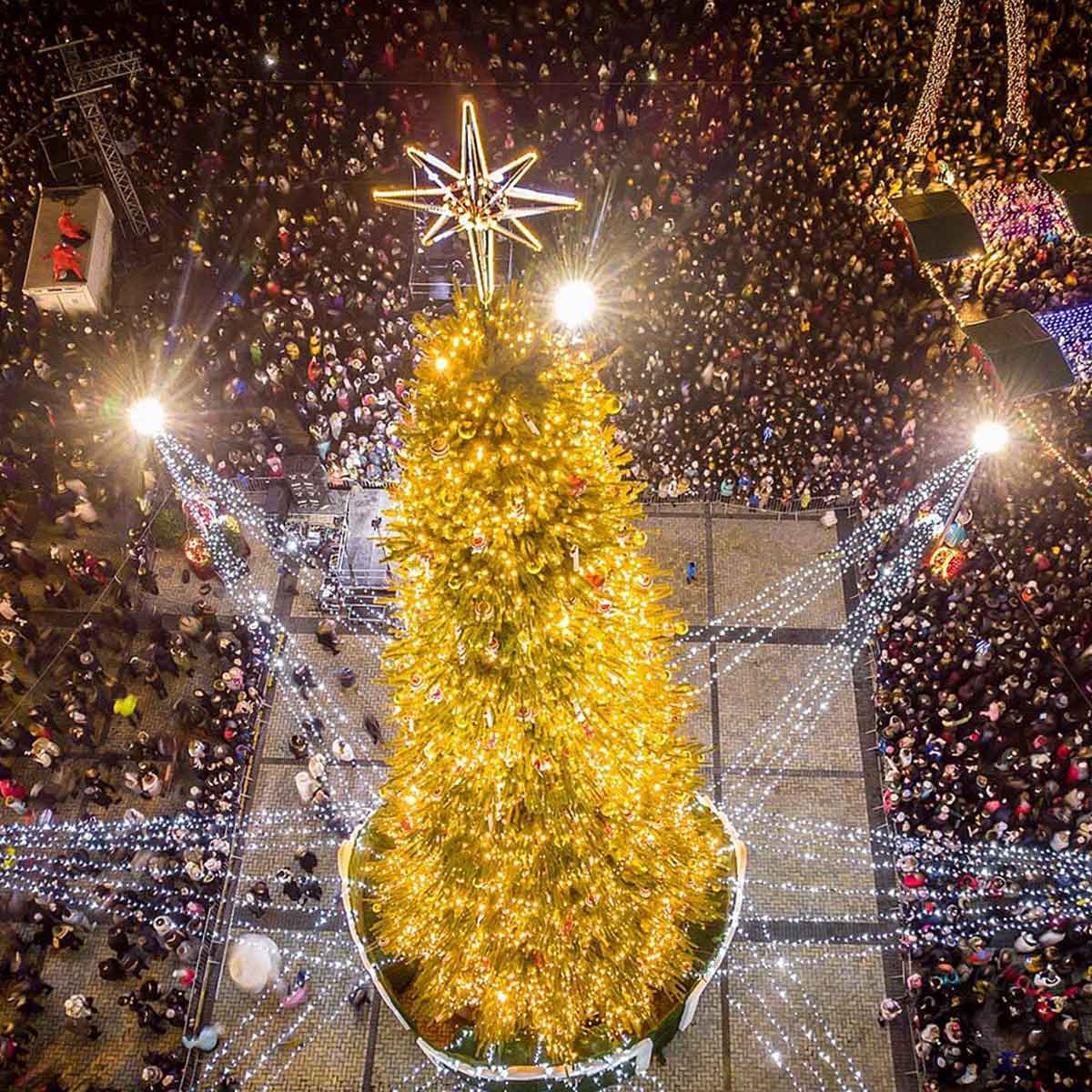У 2018-му з Карпат знов привезли живе дерево й прикрасили його неоновими гірляндами, створивши ефект північного сяйва. Через рік ялинку оздобили сотнями іграшок і кілометрами гірлянд – вона виглядала справді святково й казково.