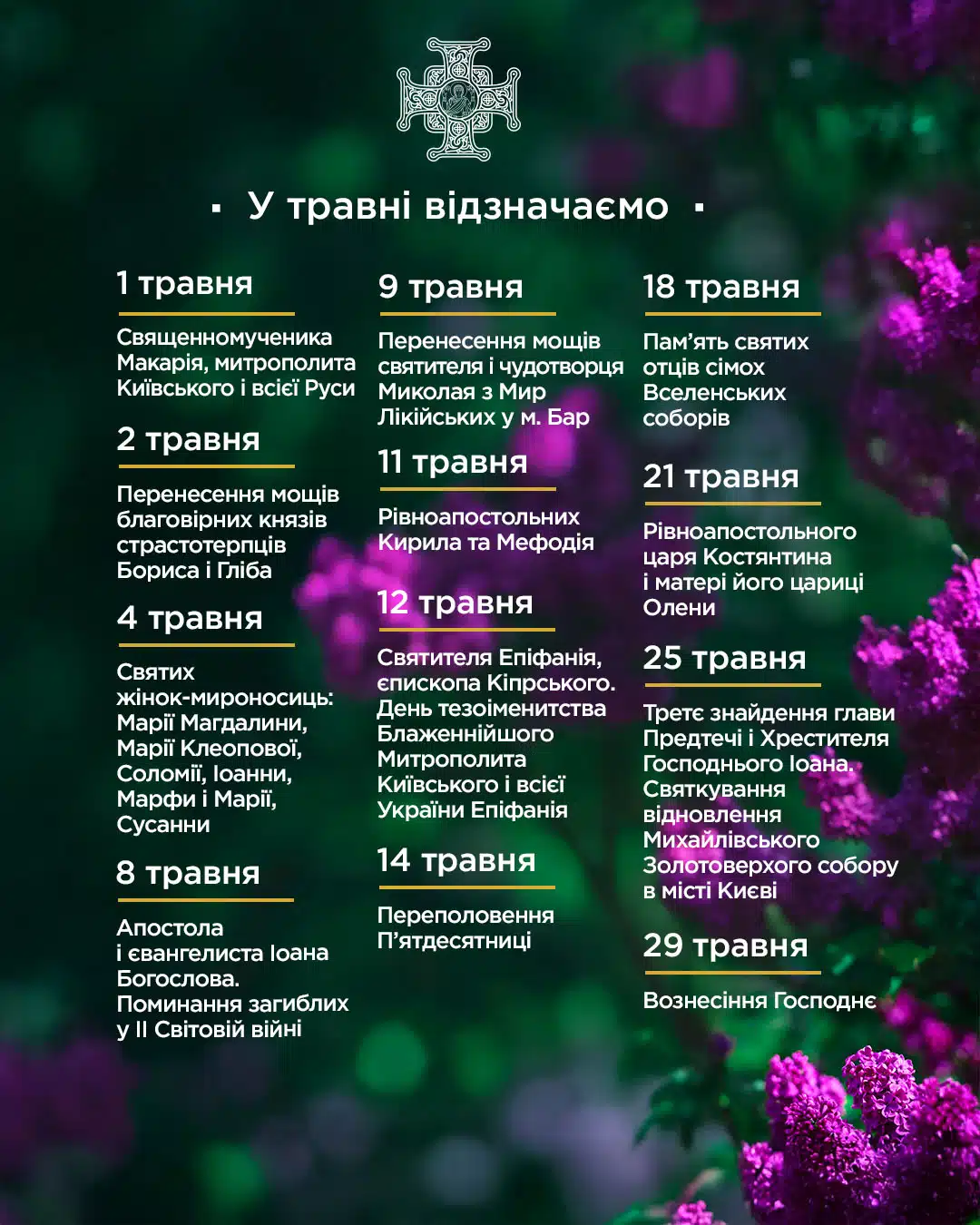 У травні багато церковних свят і важливих, пов’язаних зі святими угодниками Божими та церковною історією України. Proslav публікує церковний календар на травень, посилаючись на повідомлення ПЦУ.