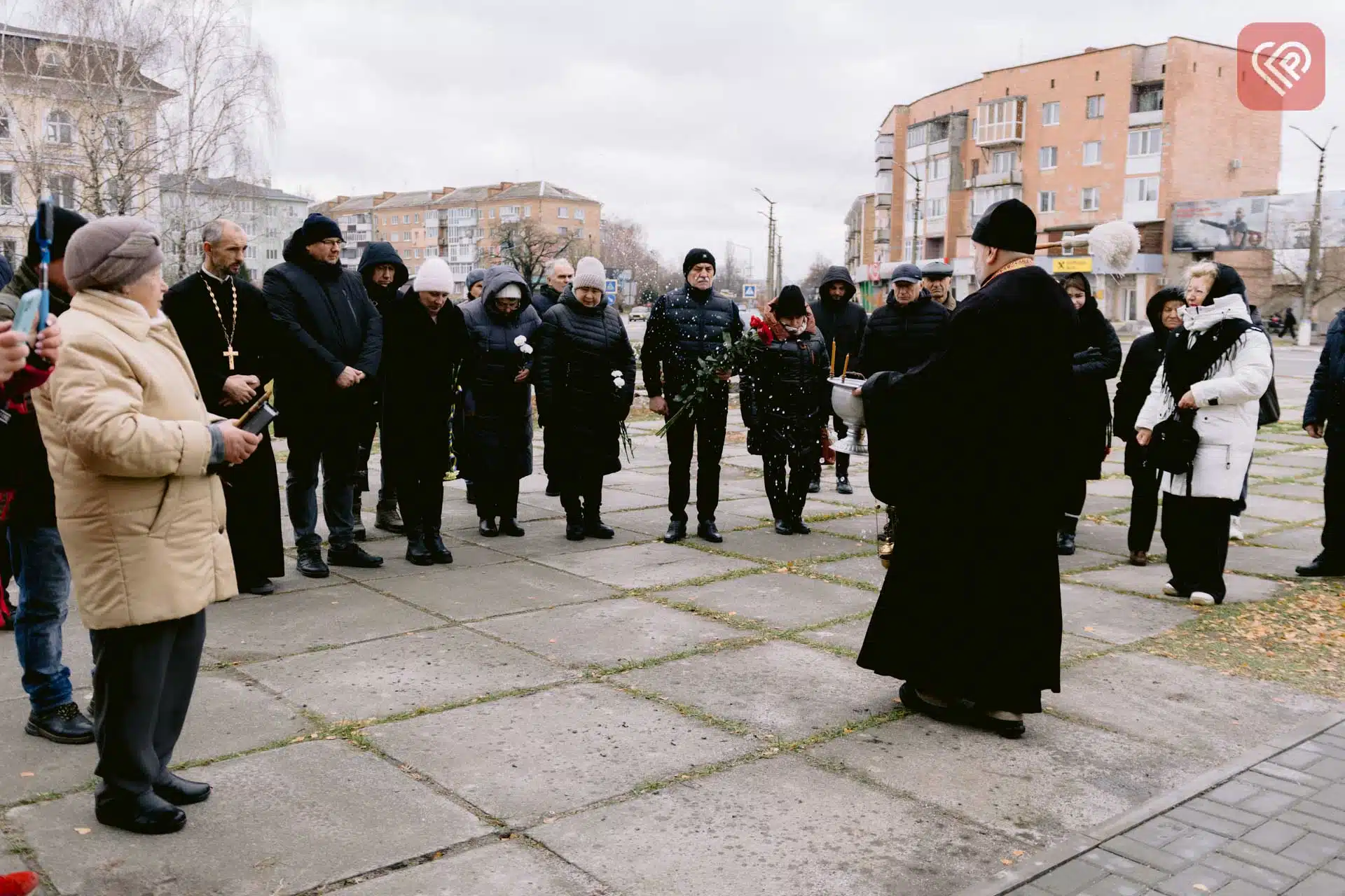 «Таку скорботну подію ми починаємо з освячення. І це освячення не просте, адже серед усього, що є матеріальне й переважає над усім – це хрест. На ньому було розп’ято нашого спасителя Господа Ісуса Хреста… Ми, християни, преклоняємося і визнаємо хрест знаменням перемоги, визволенням добра від зла, перевершенням добрих сил над злими. Можна сказати, що зараз Україна розпинається на хресті ворогом, який не може жити спокійно, доки живемо ми… Але ми, українці, продовжуємо невпинну боротьбу і чекаємо, коли настане відродження і воскресіння нашого народу, і нашої держави із великого занепаду», – промовив священник.