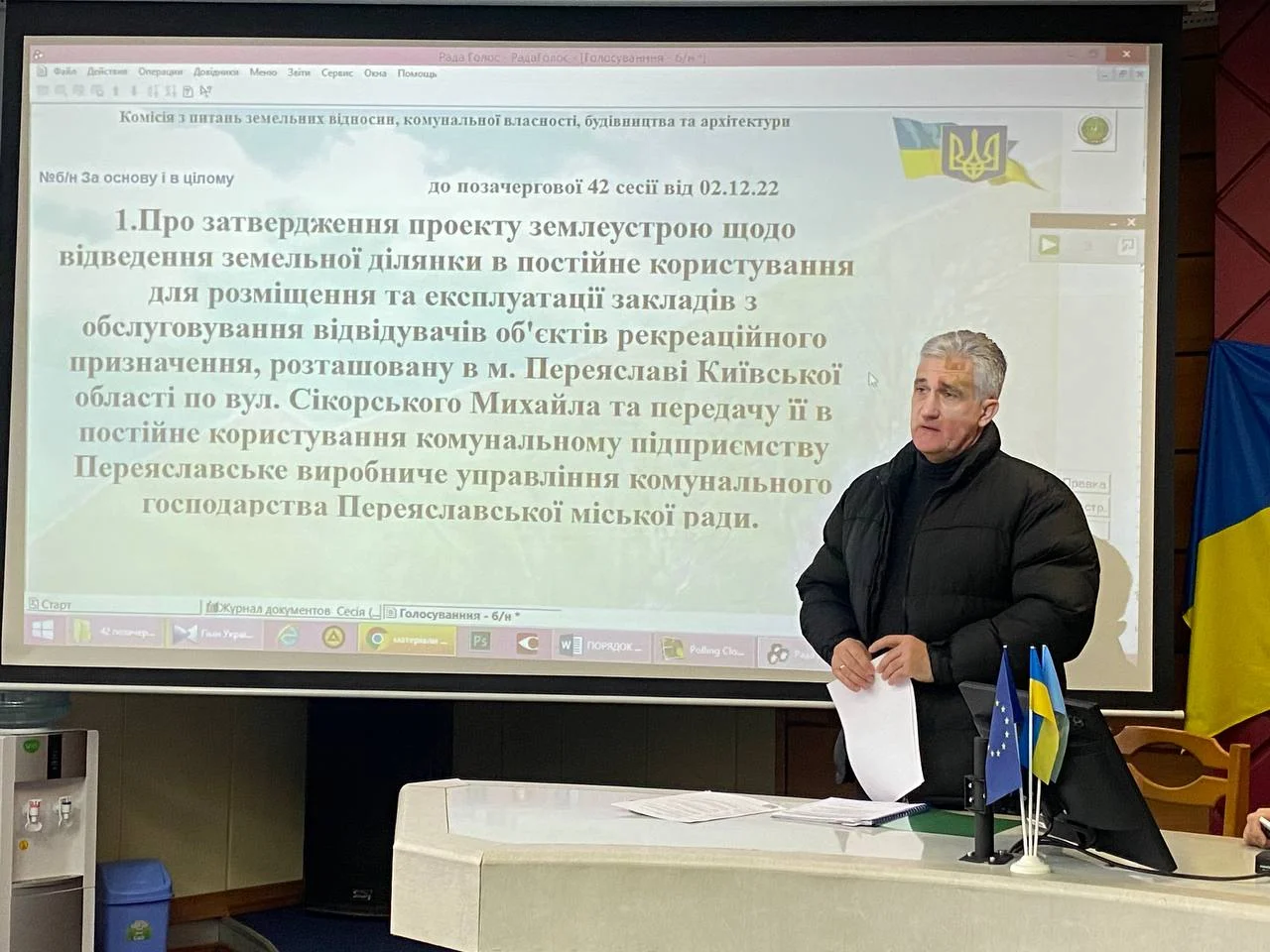 До розгляду було представлене одне питання – про затвердження проекту землеустрою щодо відведення земельної ділянки в постійне користування для розміщення та експлуатації закладів з обслуговування об’єктів рекреаційного призначення. Мова йде про земельну ділянку колишнього «військового містечка», за адресою вул. Михайла Сікорського, та передачу її в постійне користування КП Переяславське ВУКГ.