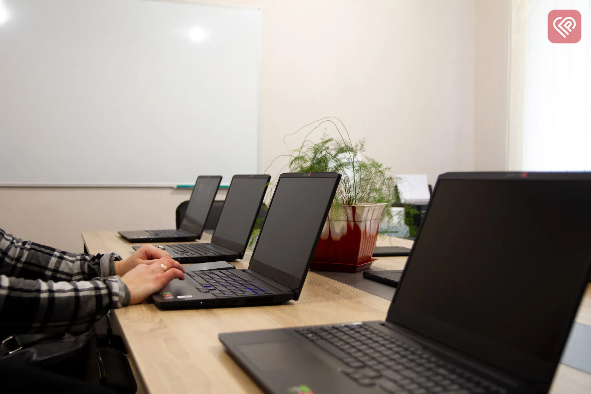 Друга кімната – конференц-зал, оснащений швидкісним інтернетом, чотирма ноутбуками та двома планшетами, якими можна безкоштовно скористатися. На випадок тривалих відключень світла підготували генератор та павербанки. Там проходитимуть консультаційні зустрічі, засідання ради ВПО, презентації, навчальні курси.