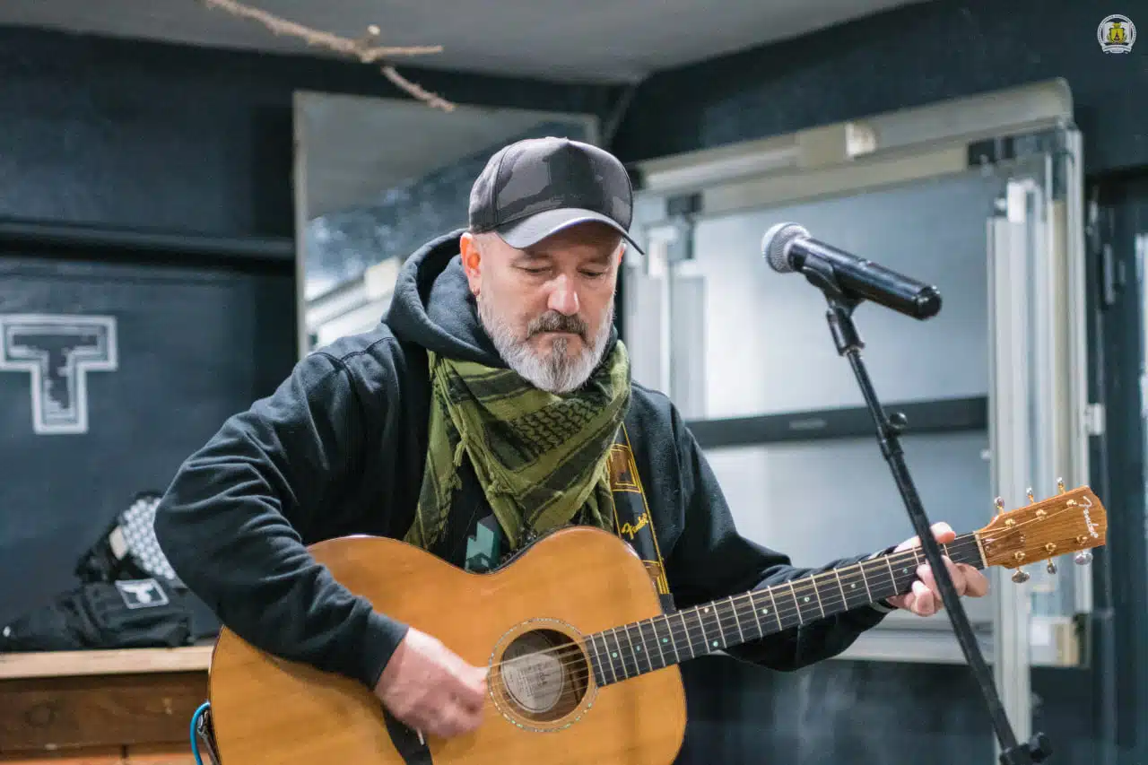 У цей вечір усі охочі переяславці мали нагоду зустрічі не лише з музикантом, а й досвідченим воїном. Віталій Кириченко – стрілець 130-го батальйону 241-ї бригади. Його бойовий шлях пролягав через визволення Харківщини (Вовчанськ, Малововчина), Луганщину та пекельний Бахмут у квітні-травні 2023 року. За три роки він проїхав понад 100 000 кілометрів дорогами Донбасу.