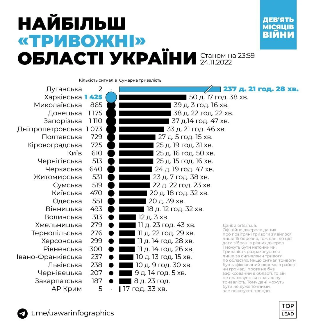 Київщина займає 14 місце серед «найтривожніших» областей України. Загалом повітряна тривога в нашій області тривала 20 днів 18 годин і 32 хвилини (470 сигналів).  Інфографікою «Дев’ять місяців війни» поділився «Top Lead».