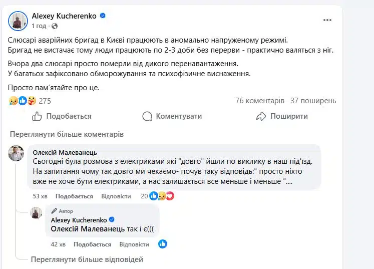 За його словами, комунальники працюють у вкрай складних погодних умовах і з колосальним навантаженням, не жаліючи власних сил, аби якомога швидше повернути киянам життєво необхідні послуги. На жаль, такий надлюдський темп роботи дається взнаки і має трагічні наслідки.