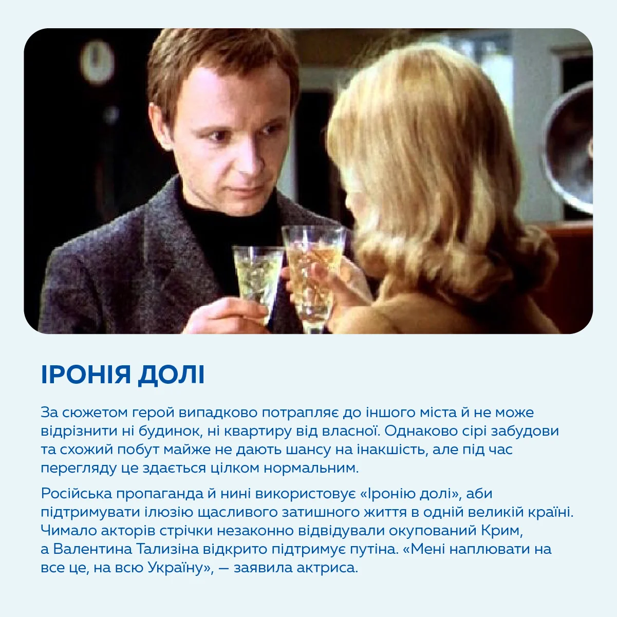 Якщо, можливо, сьогодні вам захочеться провести старий рік під таку улюблену «іронію долі» чи умовно «Службовий роман», то пам’ятайте, що путіна підтримує зірка цих фільмів актор Олександр Берда. Також ще на початку війни актриса Валентина Тализіна, яка стала відомою завдяки «Іронії» сказала наступне: «Мені наплювати на все це, на всю Україну. А що мені робити, нехай вони залишаться без комедії. Вони вже без багатьох фільмів залишилися. Ця Україна – паноптикум якийсь».