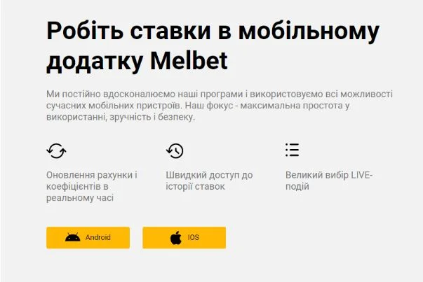 Усі букмекерські контори намагаються створити найкращі умови для гравців, що заходять до них у гості з мобільних пристроїв. Не є винятком і компанія Мелбет — популярний беттінговий оператор, давно відомий українським прогнозистам та поціновувачам казино. Гості цього закладу мають змогу грати як у браузері, так і через зручний додаток. Програму Melbet скачати можна на девайси з операційними платформами Android та iOS. Вона займає зовсім небагато місця. Посилання на файл для завантаження з’являється відразу після входу на офіційний сайт зі смартфона чи планшету. Також його можна знайти у головному меню.