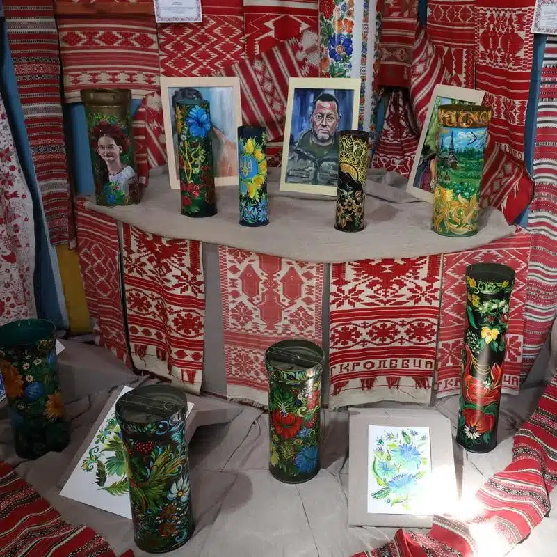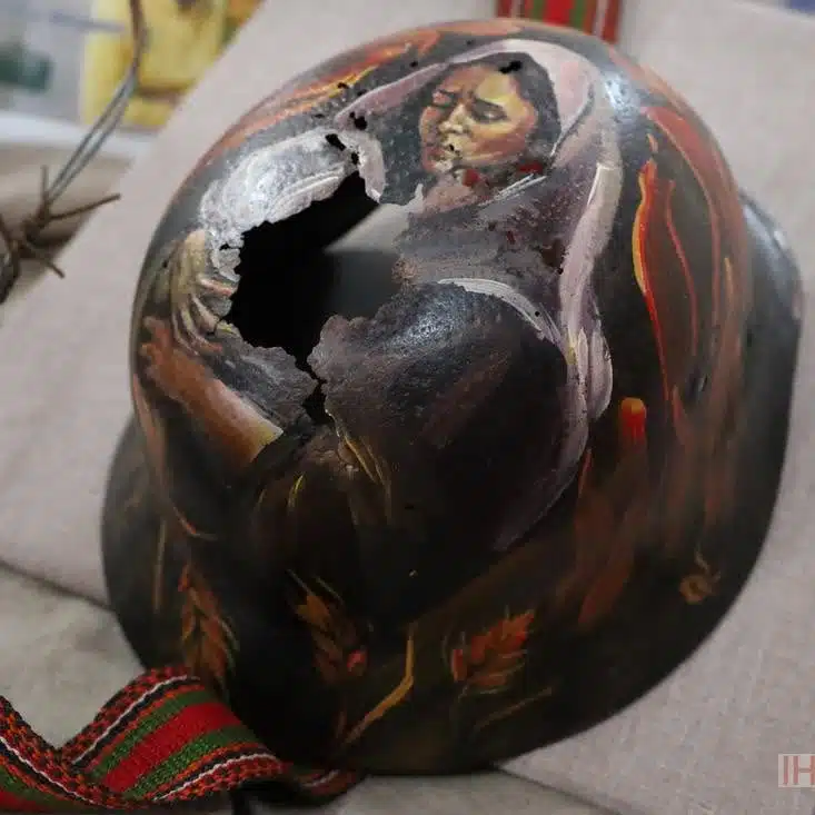 Серед центральних експонатів виставки – «Каска. Українська П’єта». Це бойова каска, на якій художниця зобразила жінку, що схилилася над загиблим воїном. Цей образ – візуальне переосмислення П’єти, де мати тримає на руках тіло сина.
