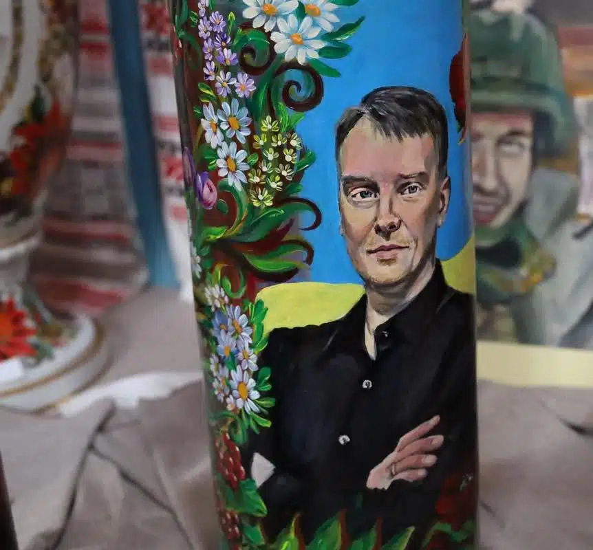 Не менш промовисто виглядають тубуси з портретами полеглих українських захисників, які до війни були музикантами. Замість скрипок, труб і диригентських паличок вони тримають зброю.