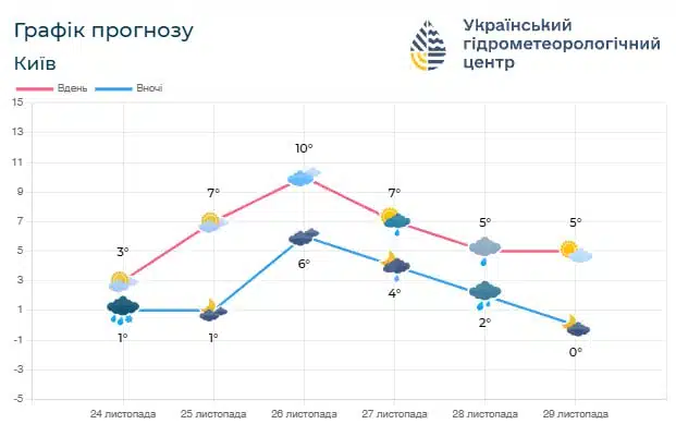 Упродовж п’яти діб фахівці прогнозують коливання температури вдень і вночі в межах 5-6°. Найтеплішим буде 26 листопада – напередодні атмосферного фронту, який підійде 27 листопада. Після його проходження в регіон почне надходити прохолодніше повітря. Перші відчутні зміни прогнозують удень 28 листопада, а найпомітнішим похолодання стане вночі 29 листопада.