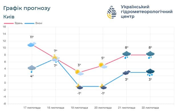 21 листопада зросте ймовірність дощу. Нічна температура перейде в плюсовий діапазон, трохи теплішим буде і день.