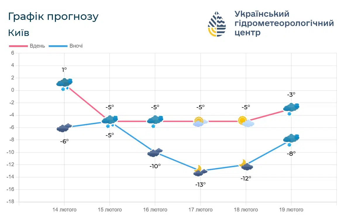 Температура по області вночі опуститься до 9-14° морозу, а вдень складе 2-7° морозу. У Києві вночі буде 11-13° морозу, у денні години 4-6° морозу.